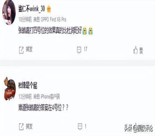 球迷對(duì)于張皓嘉在四號(hào)位的神奇表現(xiàn)同樣給出了高度評(píng)價(jià)表示:張皓嘉打四號(hào)位的效果真的比杜潤(rùn)旺好,難道他才是廣東宏遠(yuǎn)的四號(hào)位答案?