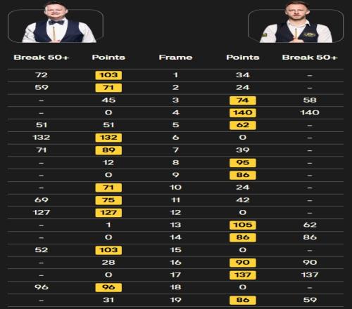 第一階段過后雙方戰(zhàn)成4-4平,第二階段上半場特魯姆普先勝一局,墨菲連勝三局7-5領(lǐng)先進(jìn)入中場休息,下半場雙方交替領(lǐng)先,戰(zhàn)至9-9平,決勝局墨菲率先上手,特魯姆普抓住機(jī)會逆轉(zhuǎn)獲勝。