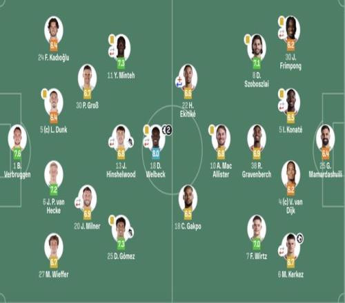 布萊頓(4231):1-維爾布魯根;27-魏費(fèi)爾,6-范赫克,5-鄧克,24-卡迪奧盧;20-米爾納(76’17-巴萊巴),30-格羅斯;25-戈麥斯,13-辛謝爾伍德(83’26-阿亞里),11-明特(76’22-三笘薫);18-維爾貝克(83’10-魯特爾)